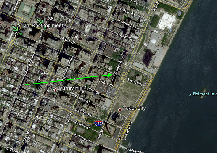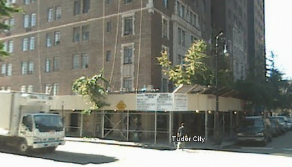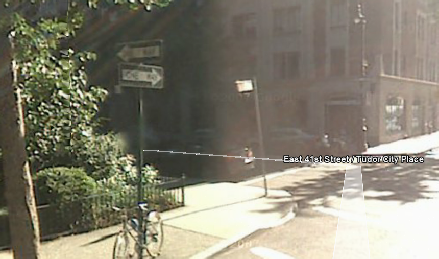 Then it cuts to the next day. We start with a view looking north up Tudor City Place and then it pans to Tony outside a park on East 41st Street talking on a pay phone at the NW corner of the intersection of Tudor City Place and East 41st Street. He finishes his call and joins his party parked on the south side of East 41st Street by Tudor City Place.